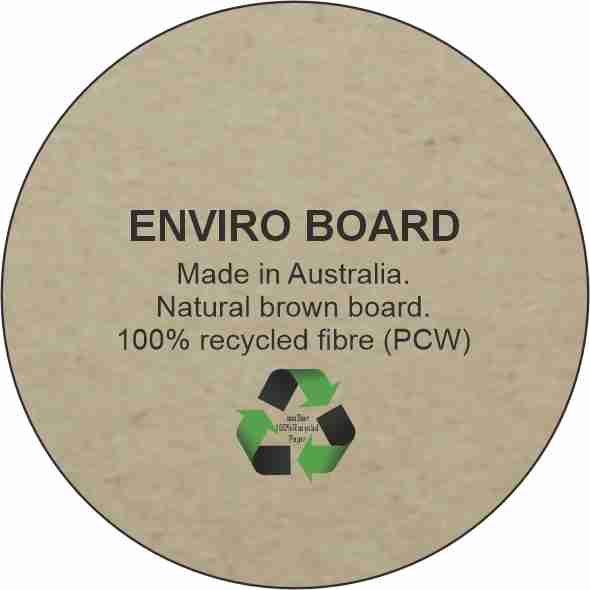 Made in Australia. Natural brown board. 100% recycled fibre (PCW)
